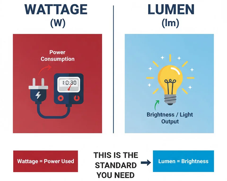 Conclusion: When selecting LED fixtures, Wattage (W) only represents power consumption, while Lumen (lm) is the true standard for measuring brightness.